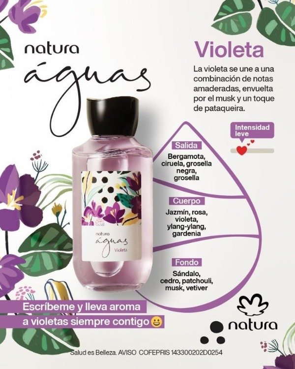 La delicadeza de la violeta se une a una combinación de notas amaderadas, envuelta por el musk y un toque de pataqueira, ingrediente de la biodiversidad brasileña.