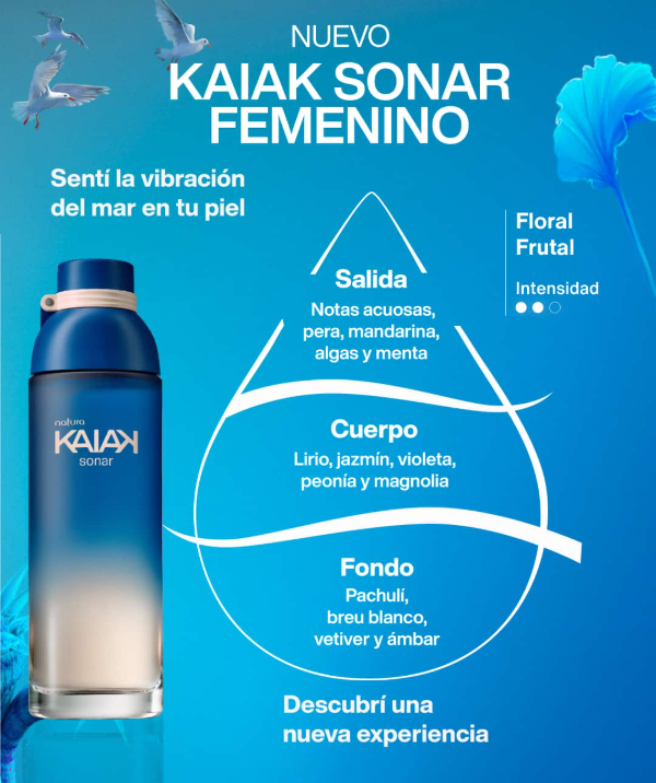 Sentí la explosión de frescura azul despertar tus sentidos. Sentí la ultra frescura que impacta, con una combinación de notas anisadas y acuaticas con la frescura del estoraque, un ingrediente de la naturaleza brasileña, realzado por maderas de cedro y pachulí. La vida pide agua. El agua pide vida. Kaiak Sonar inaugura una tecnología exclusiva de Natura y sin precedentes en el mundo de la perfumería que permite traducir sonidos y colores en moléculas olfativas. Para resaltar más el perfume, aplica en las muñecas, cuello, hombro y detrás de las orejas. (notas acuaticas, lirio, ambar) Hecho en Brasil.