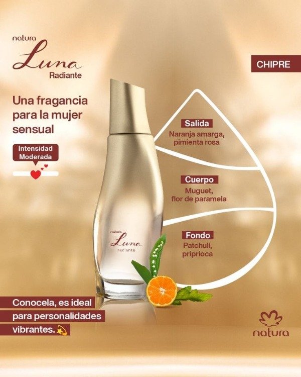 En Luna Radiante el chipre brasileño, acorde exclusivo de Luna, gana luminosidad con notas cítricas intensas.